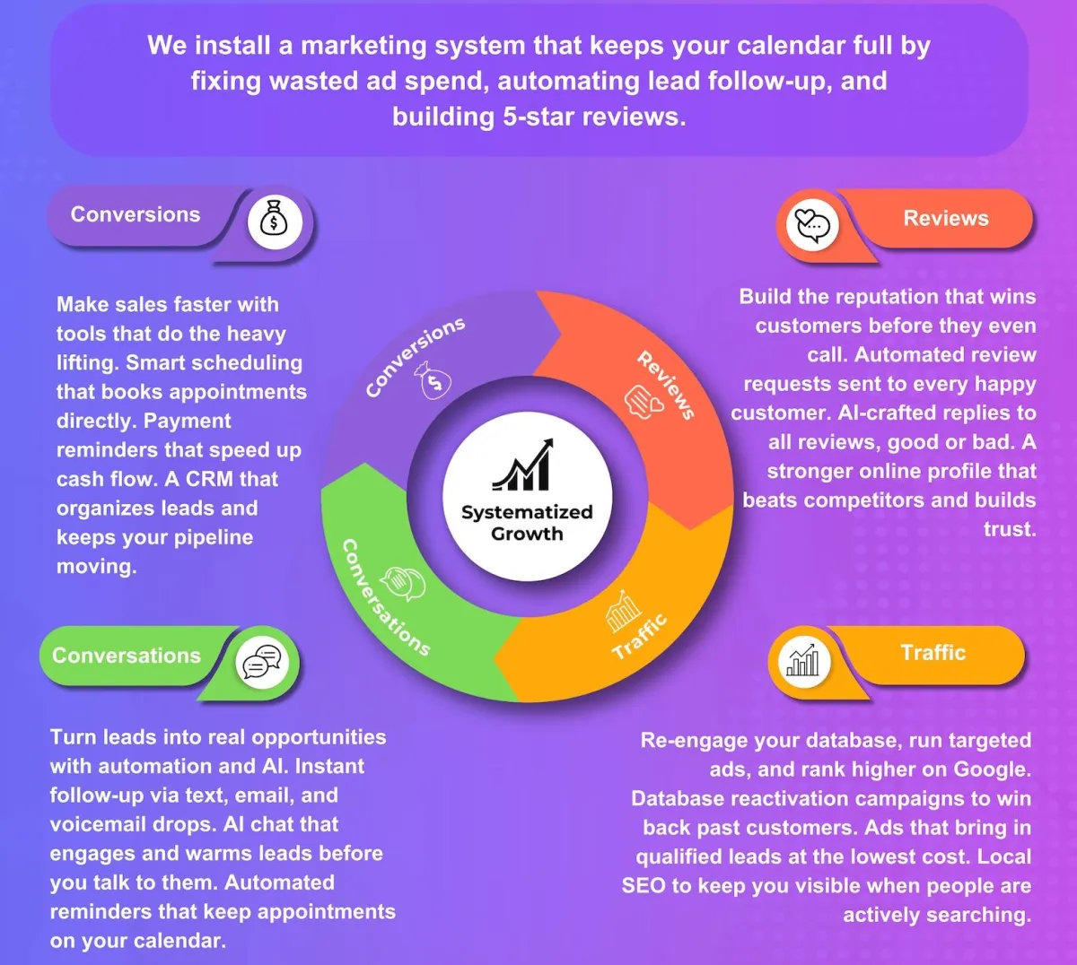 The Marketing Flywheel works by bringing in qualified traffic, turning leads into booked appointments through smart automation, and building your 5-star reputation so you become the obvious choice in your market.